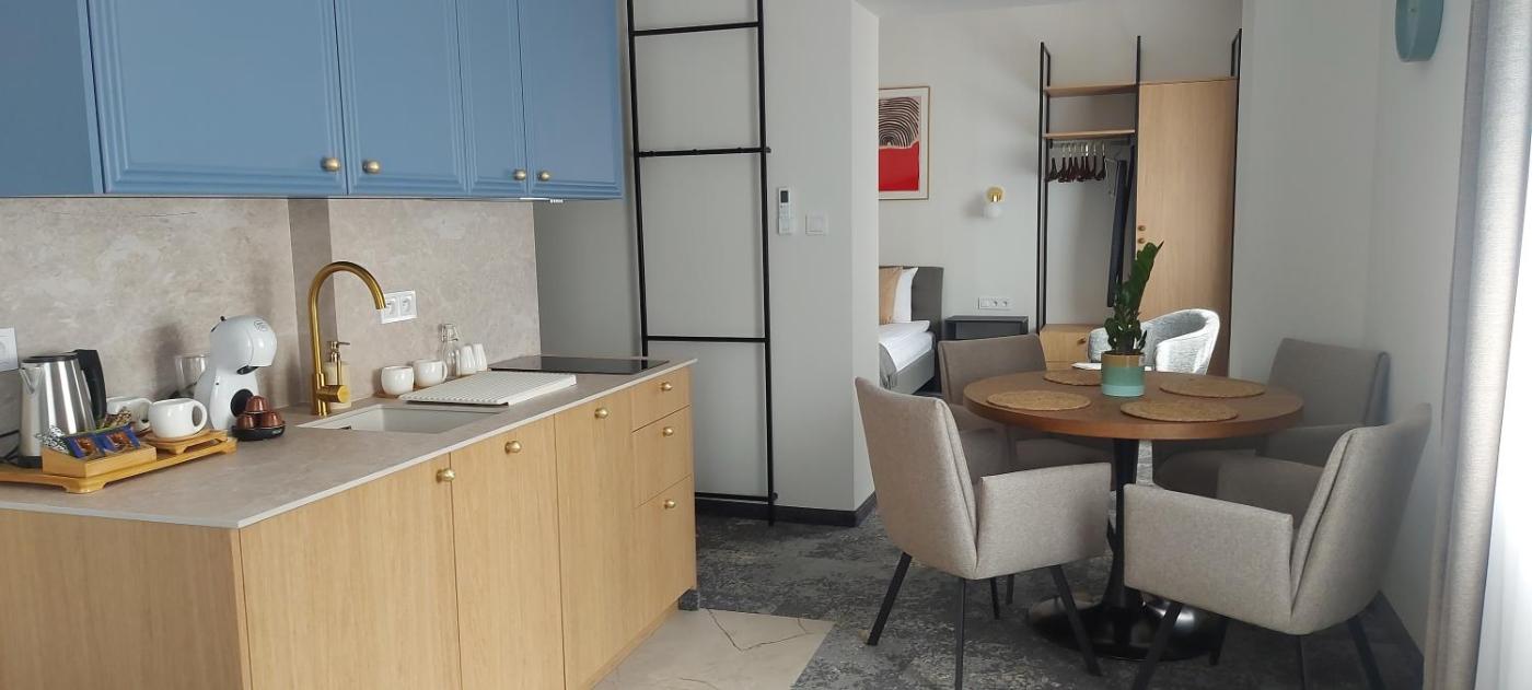 Apartament. The air-conditioned apartment has 1 bedroom and 1 bathroom with a shower and a hairdryer. Guests can make meals in the kitchen that features a stovetop, a refrigerator, a dishwasher and kitchenware. The apartment features a tea and coffee maker, a seating area, a sofa, a flat-screen TV, as well as city views. The unit has 1 bed. Apartament - 2 osobowy. Powierzchnia pokoju ok.: 40 mkw.